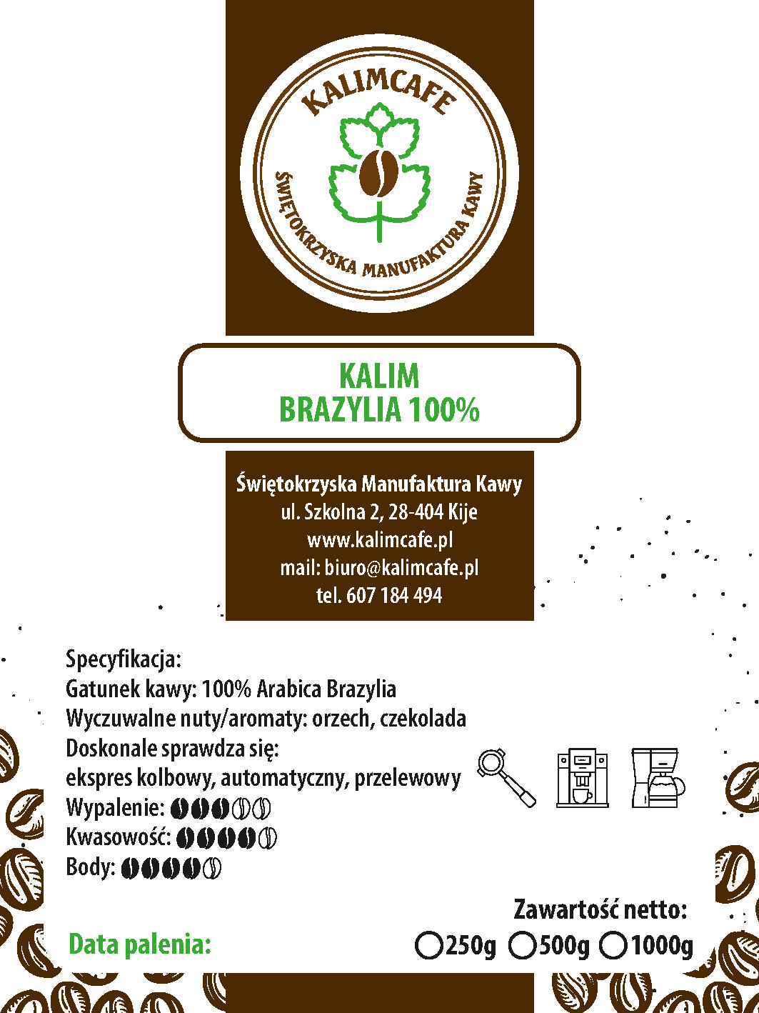 100% Arabica , które pozwala na wydobycie z kawy to, co najlepsze. Ta inteligentna dobrana mieszanka arabik z Ameryki Środkowej, doskonały smak o bogatym i dostępnym aromacie. Stworzony z myślą o koneserach, gęstym naparem oraz jasną, delikatną kremą , utrzymującą długo po przygotowaniu. KALIM BRAZYLIA doskonale sprawdza się w ekspresach ciśnieniowych .